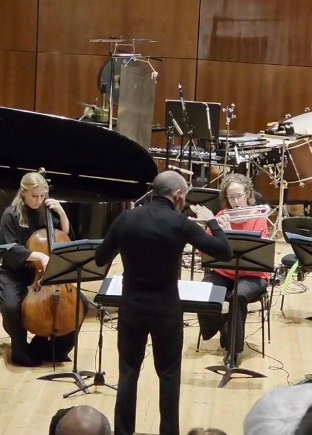 In a medium shot from behind the audience, a conductor in a black turtleneck and black slacks leads a small orchestra, including a cello player on the left and a flute player on the right. The cello player has blonde hair pulled back, and the flute player has light brown hair. The conductor stands with his back to the camera, his arms moving to direct the musicians. Behind the musicians is a piano, various percussion instruments, and music stands. The scene takes place in a concert hall with light wooden paneling. The audience is visible in the foreground, with their heads and shoulders showing.
