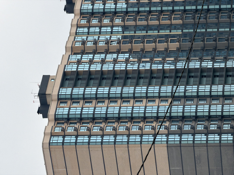 This image depicts a modern, multi-story residential building located in Beryozovy, Russia, viewed from a slightly low angle under an overcast sky. The building features a multi-faceted facade composed primarily of light brown brickwork and extensive sections of light blue reflective glass windows set in dark frames. Multiple vertical columns of recessed balconies with dark railings are visible. Numerous external air conditioning units are affixed below windows, particularly on the brick sections of the building. The lowest two visible floors are clad in a darker gray material with horizontal banding. The roofline is dark-colored, featuring several structures including vents, antennas, and a visible ladder on one section. A dark utility wire traverses diagonally across the lower-middle portion of the frame, partially obscuring the building. No individuals are visible, and no discernible actions or interactions are occurring. The environment is characterized by a uniform light gray sky.