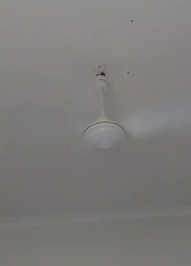 white ceiling fan mounted to a white ceiling. The fan has gold trim around the edge of its central housing. There are a few small dark spots on the ceiling near the fan mount. The fan is operating, with its blades rotating, though they are slightly blurry in the video. The video appears to be shot from below, looking upwards at the fan.