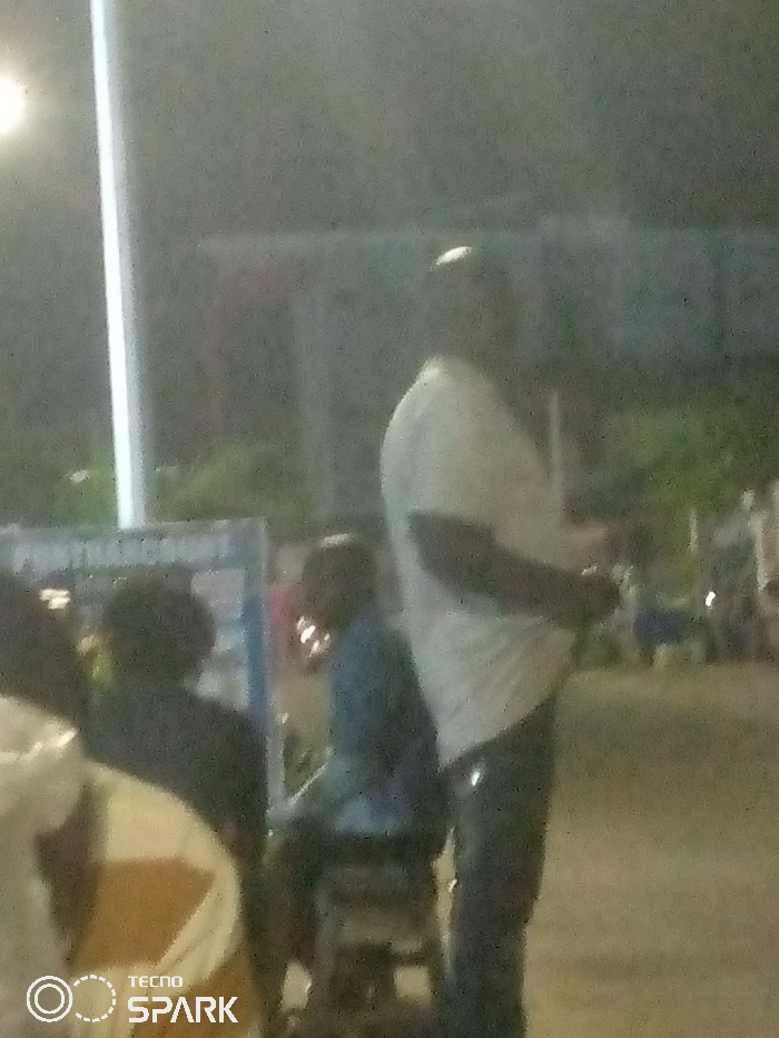 At night, a person stands in a light-colored shirt and dark pants. Nearby, another individual sits on a chair. A signboard with illegible text is visible. Streetlights and foliage create a blurred background. The scene appears dimly lit. The TECNO SPARK watermark appears in the lower left corner of the image.