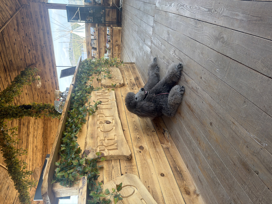 The image depicts a rustic reception area located in Velingrad, Bulgaria. A charcoal-gray standard poodle, wearing a pink collar/leash, lies relaxed on a light-colored wooden plank floor in the foreground, facing right with its mouth slightly ajar. Directly behind the dog is a heavy, light-brown wooden reception desk adorned with carved letters spelling "RECEPTION" and decorated with artificial green ivy garlands draped across its front and top. The desk extends to the left, where another carved wooden sign with a circular motif is visible. Above the desk, more ivy garlands are suspended from the wooden plank ceiling. To the right of the desk, a large window reveals an outdoor scene featuring a white tipi tent in the mid-distance and forested hills under a partly cloudy sky in the background. Inside, to the far right, rustic wooden display shelves and a black metal display stand hold various items. The interior walls and ceiling are constructed from light-toned wooden planks.