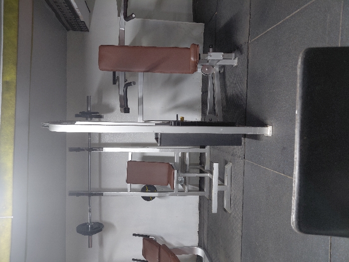 A workout area presents weight lifting equipment against light walls and a dark floor. A central machine includes a padded seat and weight storage, with a barbell and weights nearby. A chair and additional equipment are also visible in the frame.