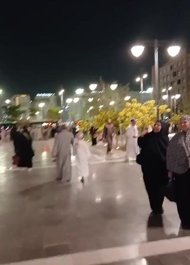 The video depicts a nighttime urban scene filled with people. Many individuals, some clad in traditional Middle Eastern garments, are walking along a paved plaza. The plaza is illuminated by numerous streetlights with rounded lamps. Buildings, varying in height, line the perimeter of the plaza. In the background, a tall spire-like structure is visible. The camera appears to be handheld, leading to some shakiness in the video.