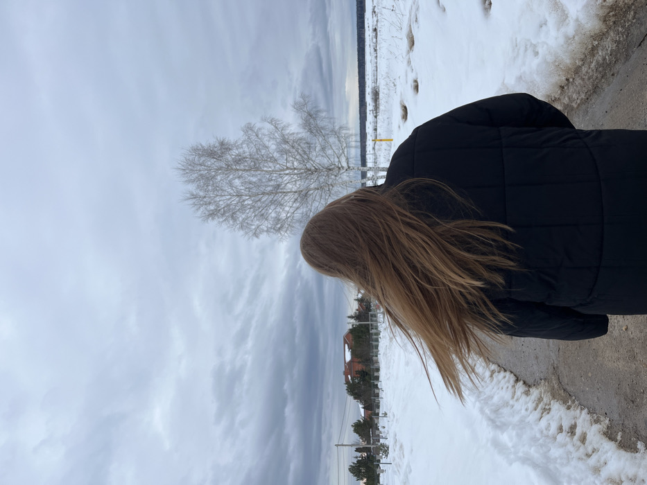 The scene, located in Kalinino, Russia, captures an individual walking away from the camera on a narrow, dark-colored path. The person has long, light-brown hair, visibly blowing to the left, and is wearing a black puffer jacket with horizontal stitching. The path is bordered by snowbanks on both sides. To the right, an expansive, snow-covered field with patches of exposed dry vegetation stretches towards a distant horizon marked by a faint tree line. A single bare deciduous tree with light-colored bark stands prominently in the mid-ground within the field. In the left background, several residential buildings, including one with a reddish-brown roof, are visible behind a fence and sparse trees. The sky is entirely overcast with a uniform layer of gray clouds. The environment indicates a cold, winter or early spring season.