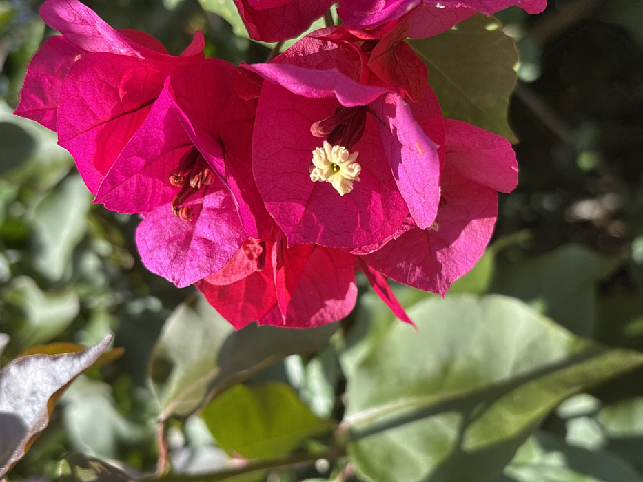 The image presents a close-up, high-angle view of vibrant fuchsia-pink bougainvillea flowers, situated outdoors in Ciudad de la Costa, Uruguay. The central focus is a cluster of three prominent blooms, each displaying thin, papery bracts. Within the lower-center flower, a small, tubular true flower with a creamy-white base and faint yellow pistils/stamens is distinctly visible. The bougainvillea appears brightly lit by natural sunlight, casting subtle shadows on the bracts and enhancing their texture. The background consists of out-of-focus green foliage, including leaves and stems, suggesting a dense natural plant environment. No individuals or active interactions are present within the frame.