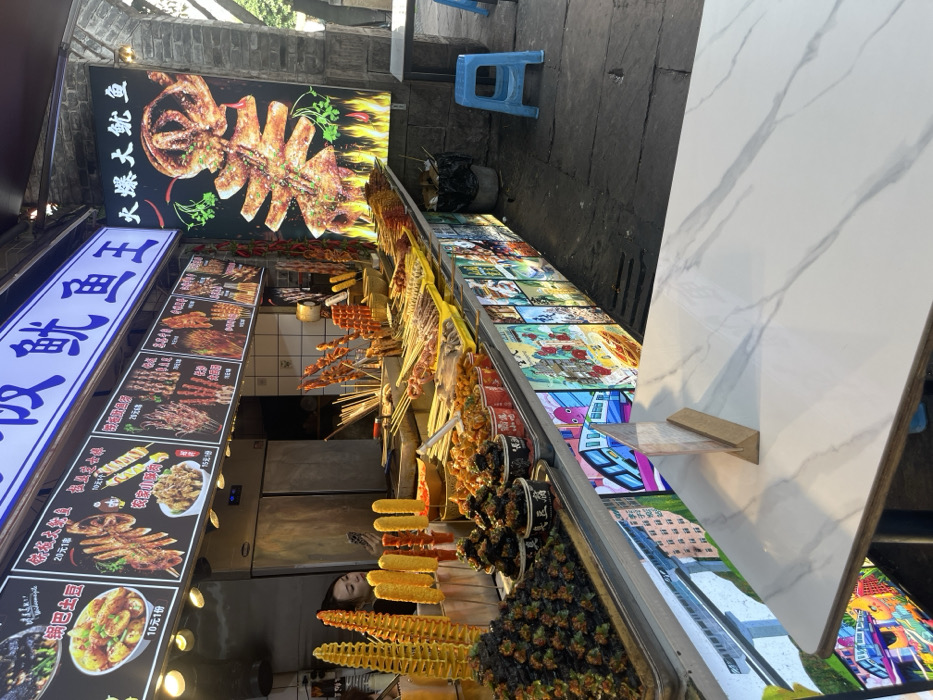 This image depicts a street food stall in Nan'an District, China, operating during evening hours