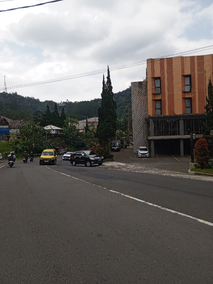 The scene depicts a roadside view in Ciloto, Indonesia, under an overcast sky. A multi-lane asphalt road with a solid white edge line and a faded dashed white lane line occupies the foreground and mid-ground. On the left side of the road, two individuals are riding motorcycles, both wearing helmets. Behind them, a yellow van is stationary, facing the camera. Further back on the left, residential structures with light-colored roofs are visible amongst dense tropical vegetation. A communication tower is present on a distant green hillside. On the right, a large, multi-story building with a distinctive facade features vertical orange and brown stripes, along with four prominent rectangular windows on its upper floors. An adjacent section of the building exhibits a light-colored, textured exterior. The ground floor of this building features large glass windows and an open, covered parking area. A black SUV is parked on an asphalt driveway directly off the main road, to the right of the yellow van. A white vehicle, possibly an MPV or SUV, is parked further back within the same property's parking area. A dark pickup truck is also visible near the entrance to this property. Tall, slender evergreen trees stand prominently in front of and around the building, with additional trees and bushes lining the road and properties. The background consists of rolling, densely forested hills and mountains beneath a cloudy, grey sky, with power lines crossing horizontally near the top of the frame.