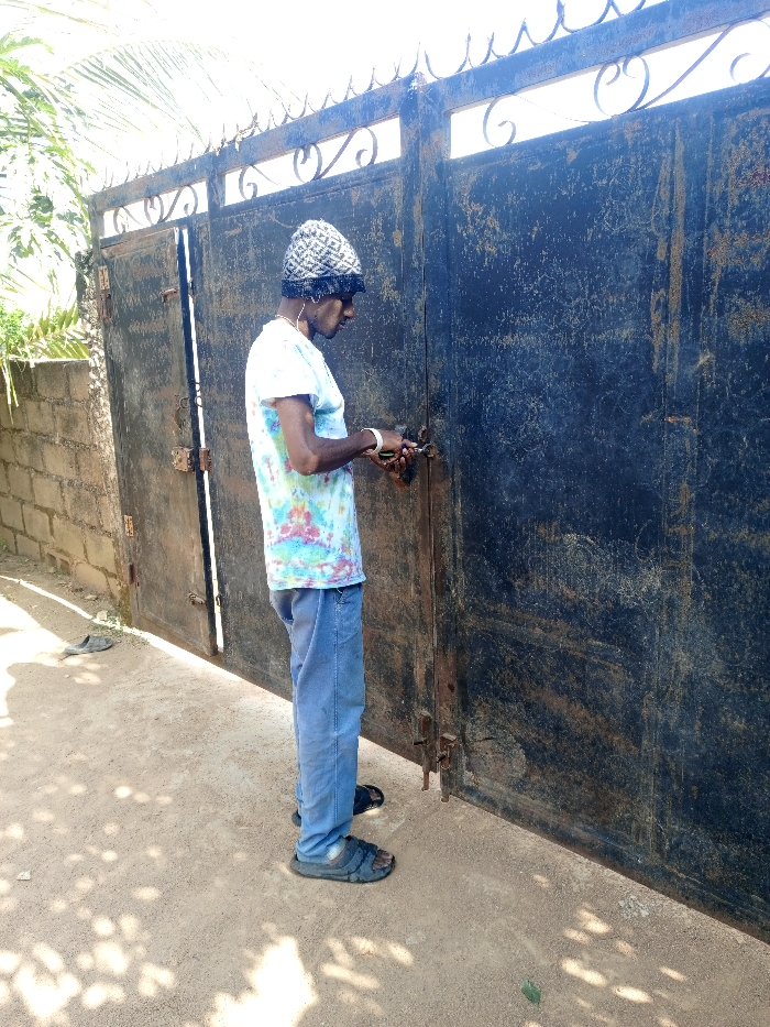 An outdoor scene in Gura Top, Nigeria, shows a male individual in profile, facing right, actively engaging with a dark, weathered metal gate
