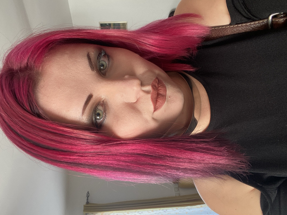 A close-up photograph depicts an adult female positioned slightly off-center, gazing directly at the camera. She has bright fuchsia pink, shoulder-length hair with visible darker roots, and green eyes accentuated with dark eyeliner, eyeshadow, and false eyelashes. Her eyebrows are thin, dark, and arched. She wears a matte, reddish-brown lipstick. Adorning her neck is a silver-toned, rigid choker necklace. She is dressed in a black, off-the-shoulder top, revealing her left shoulder. A dark brown strap, possibly from a bag, is visible over her right shoulder. The background is an indoor setting with a light-colored wall. To the left, a light-colored curtain with a dark decorative curtain rod finial is partially visible, suggesting a window or doorway. To the right, a rectangular, dark-framed object, possibly a picture or mirror, is partially visible on the wall. The image does not contain specific visual identifiers for the city of Kunje, Montenegro.