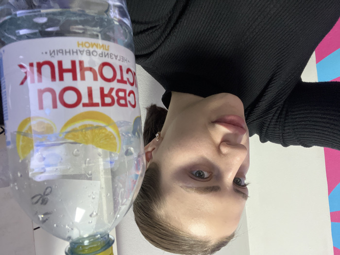 An indoor scene depicts a young adult female from the chest up, positioned slightly left of center, taking a self-portrait. She has light brown hair pulled back, a neutral expression, and is wearing a black ribbed long-sleeve top. Her right ear, adorned with a small earring, is visible. In the foreground, she holds a partially full, clear plastic bottle of "СВЯТОЙ ИСТОЧНИК" (Svyatoy Istochnik) non-carbonated lemon-flavored water, displaying two yellow lemon slices on its label. Handwritten dark markings, possibly "1/2" or "ус", are present on the upper bottle. The background consists of a white wall featuring an abstract geometric design with pink and light blue diagonal shapes. The presence of the Russian water brand suggests the location is within Russia, specifically indicated by the prompt as Rostov-on-Don.