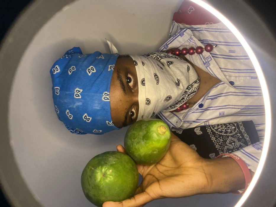 An individual with dark skin is captured indoors in Ngleshi Amanfro, Ghana, illuminated by a visible ring light. The person is looking directly at the camera. A blue bandana with a white pattern covers the head, and a white bandana with a black paisley pattern covers the lower half of the face, from the nose down. The individual wears a light-colored, possibly white or light blue, striped button-up shirt. A red beaded necklace is visible around the neck, partially obscured by the face covering. The left hand holds two green, unripe papayas. A pink wristband is present on the left wrist. The background is a plain, light-colored wall.