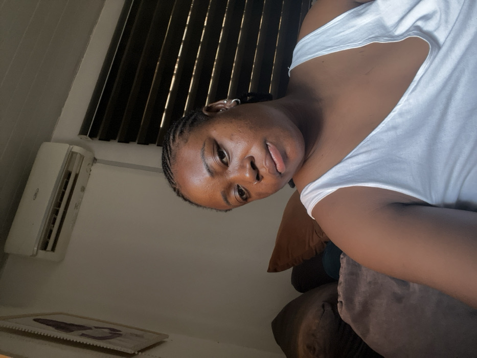 The image displays an indoor, close-up portrait of an adult female with dark skin and her hair styled in cornrows