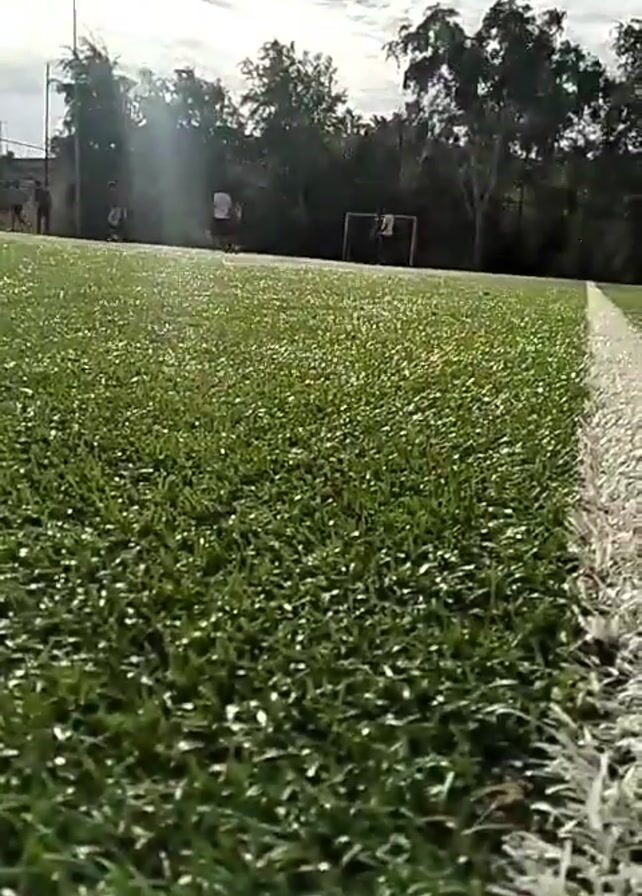 soccer field under a cloudy sky. The sun is shining brightly through the clouds. There are a few people in the distance. The camera appears to be low to the ground, near the white boundary line of the field. The field is green and artificial.