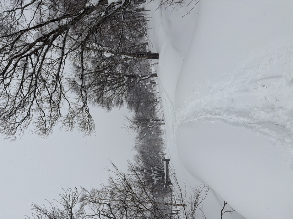 A snowy scene with bare trees and deep drifts. Tracks in the snow suggest recent passage. Overcast sky and falling snow obscure the background. Branches are heavily laden with snow. The perspective is tilted, giving an unusual view of the snowy landscape.