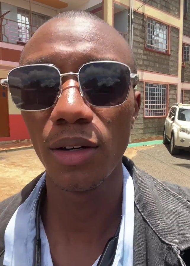 A man is taking a selfie video outside. He is wearing sunglasses, a black denim jacket over a light blue shirt, and a Bluetooth neckband. He is standing in a driveway with a multi-story building in the background. A white SUV is parked on the street in the background. The day appears sunny. The man is talking directly to the camera.