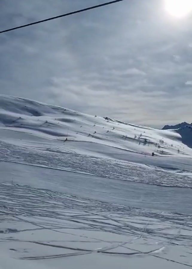 The video depicts a view from a ski lift ascending a snowy slope on a sunny day