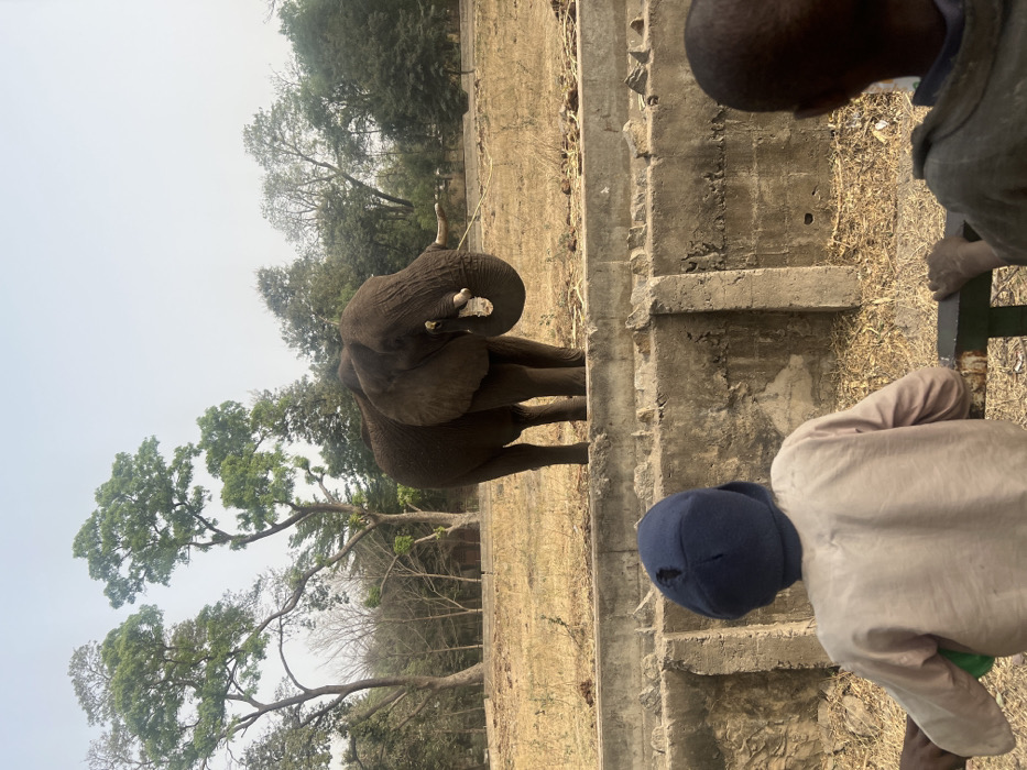 An elephant stands in a grassy enclosure, trunk raised, possibly eating. Two people are positioned at a concrete barrier, appearing to observe the elephant. One person wears a blue hat with a hole. Trees are in the background, and the day appears hazy. The image is taken from a low angle.