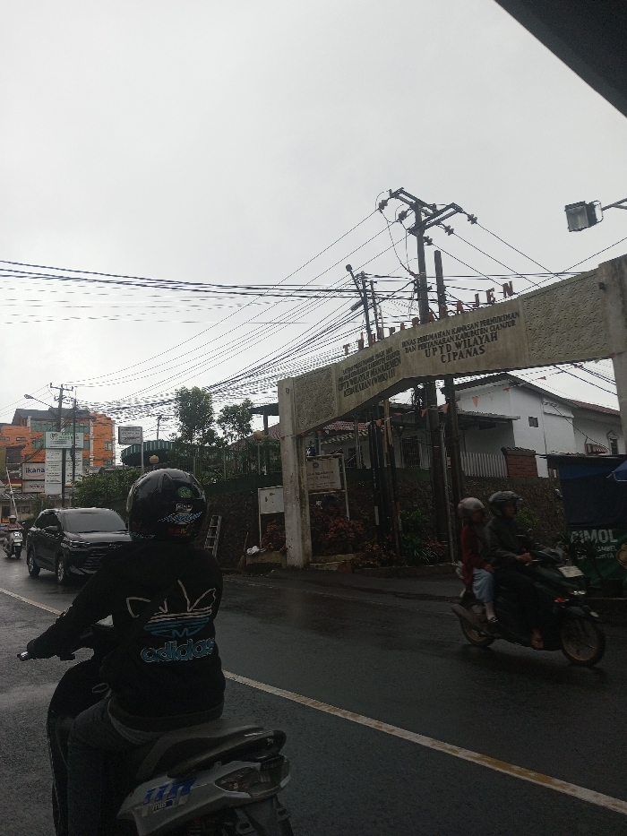 A street scene shows a motorcyclist wearing an Adidas jacket in the foreground. A dark-colored car is in the adjacent lane. In the background is an overhead sign or archway with Indonesian text, along with several buildings and utility poles with many wires. The word "CIMOL" can be seen on a nearby structure, possibly a food stall. Another motorcycle with three occupants is in the middle ground. The sky is overcast. Signage for "ikana" is visible.