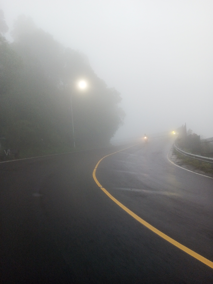 The scene is a road located in Dawathang_Dorjibi_ Kashingtsawa, Bhutan, depicted under heavy fog conditions