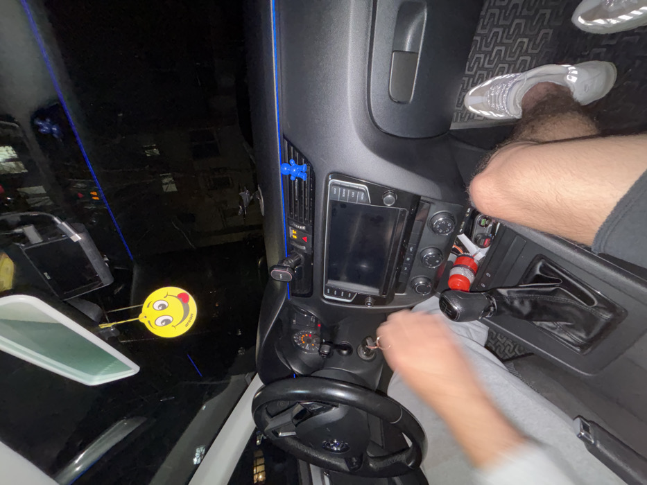 The image displays the interior of a vehicle at night in Petrich, Bulgaria, viewed from the front passenger seat towards the driver's side. The car's dashboard is dark-toned, featuring a Volkswagen steering wheel, an unlit infotainment screen, and a visible instrument cluster with red indicator lights. A thin blue LED strip runs along the top of the dashboard as accent lighting. A yellow circular "areon" brand air freshener, depicting a smiling face with a sticking-out tongue, hangs from the rearview mirror. A black device, likely a dash camera, is mounted on the windshield near the mirror. A small blue figurine, resembling a bear, is placed on the dashboard near the passenger-side air vent. The driver's blurred hands are visible: one near the steering wheel/ignition area, where keys are inserted, and another near the gear shifter of a manual transmission. The driver wears light-colored long sleeves. The front passenger's bare, hairy right leg is visible, wearing a light-colored athletic shoe with reflective accents, resting on a patterned floor mat. Part of a similar left shoe is also visible. In the center console, below the infotainment system, a red object (possibly a small fire extinguisher or bottle) and a multi-port charger are present. Through the windshield, reflections of the car's interior and faint outlines of external buildings with illuminated windows are visible, indicating an urban or residential setting at night.