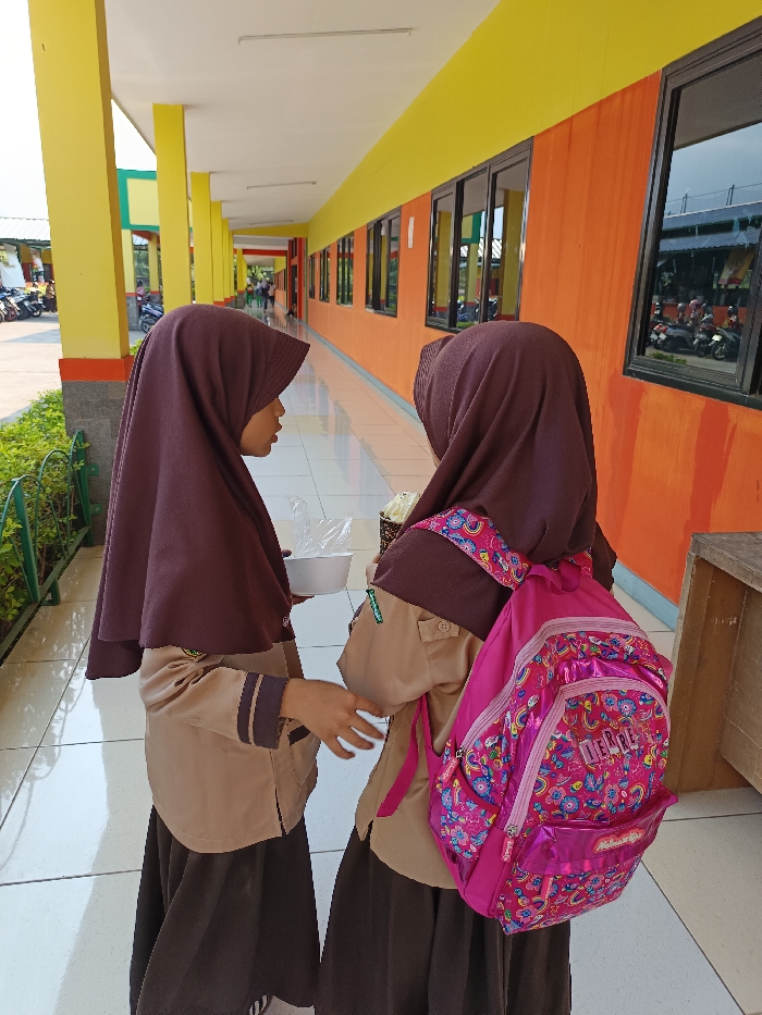 Two school-aged females, dressed in brown hijabs and tan/brown uniforms, are standing within a brightly lit school corridor in Karangtengah, Indonesia