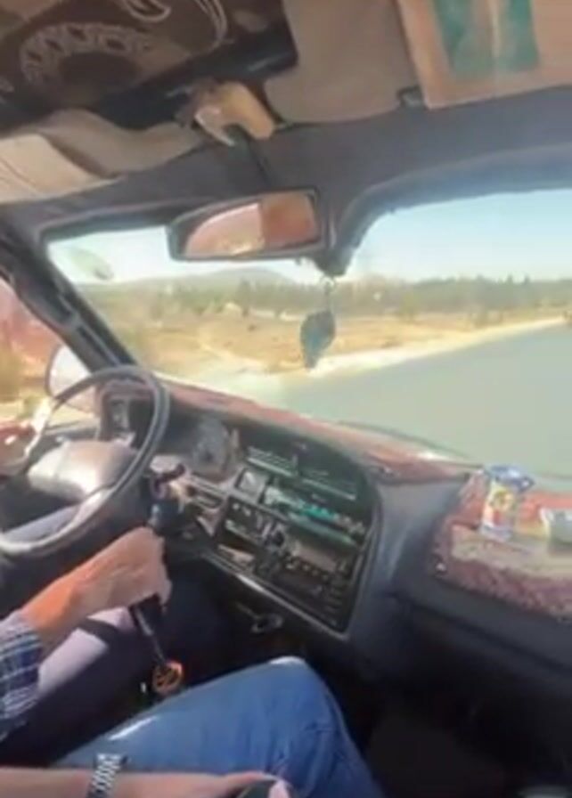 The interior of a car, presumably a minivan, is shown from the passenger seat perspective. The driver, wearing a plaid shirt, grips the steering wheel. The dashboard is covered with a patterned cloth, with decorations placed on it. A small framed photo is affixed to the sun visor. Outside, the car travels down a straight, paved road through a desert or arid landscape. Power lines and sparse vegetation are visible in the distance. Another person wearing jeans is seated in the passenger seat, holding a black circular object. The car is moving forward, and the view out the windshield shows the road ahead.