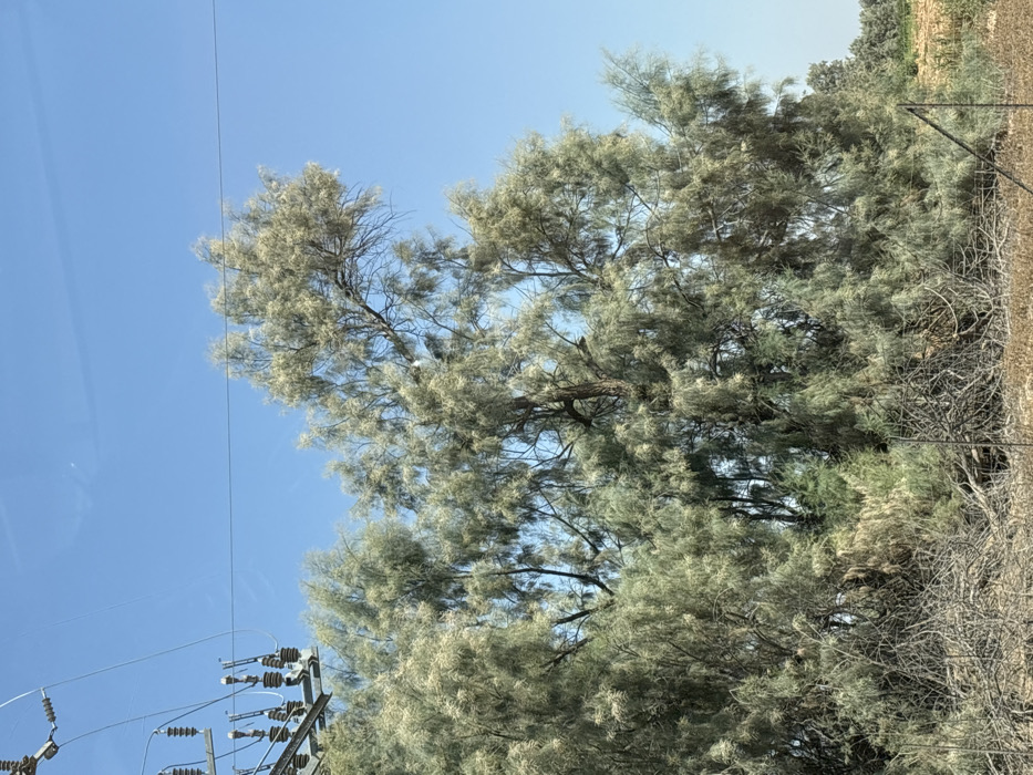 The image displays a daytime outdoor scene located in the Eshkol Regional Council, Israel. A dominant, large tree with dense, light green, feathery foliage occupies the central and right portions of the frame. Two white birds are perched on an upper branch of this tree. To the far left, a grey metal utility pole equipped with multiple ceramic insulators and power lines extends vertically and horizontally across the upper-left quadrant. The foreground consists of dry, tangled branches and shrubs on reddish-brown soil, delineated by a rudimentary wire fence with dark upright posts. Beyond this fence, to the right, a cultivated field with brown soil and sparse green sprouts is visible under a clear, bright blue sky.