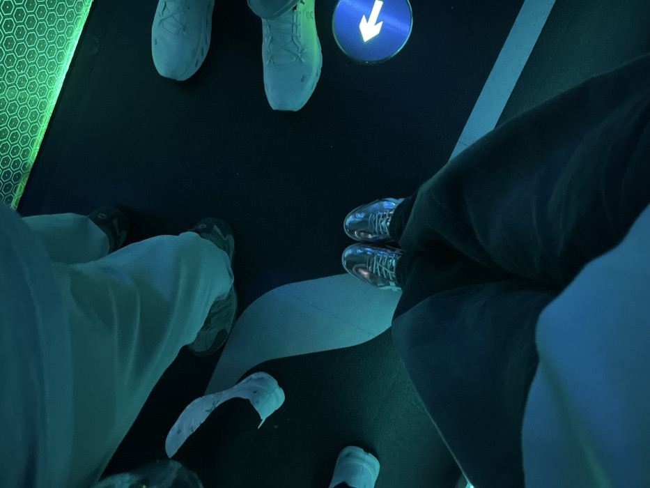 - "The image captures a high-angle view of multiple individuals' lower legs and feet within an environment illuminated by futuristic neon green and blue light, characteristic of the TRON Lightcycle Power Run attraction at Shanghai Disneyland in Pudong, China" by FM-VYYYD2, licensed under CC BY 4.0