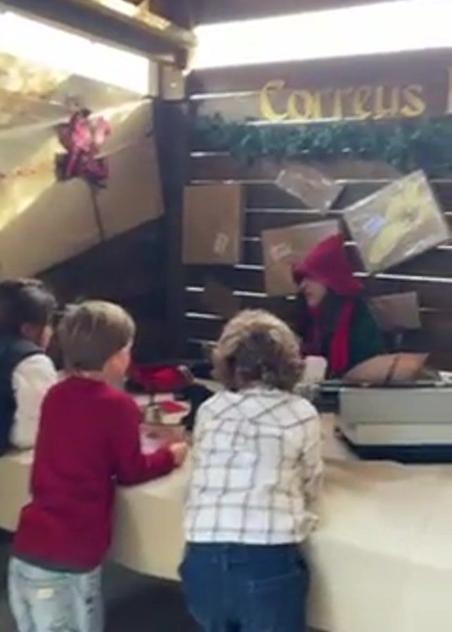 A woman dressed in an elf costume stands behind a table in a small wooden structure labeled "Correus Express". She is interacting with three young boys standing on the other side of the table. The table is covered with a white cloth. Behind the woman are packages and greenery. The boys appear to be participating in a role-playing activity at a Christmas-themed event. The woman is holding papers and smiling. One boy is ringing a bell.
