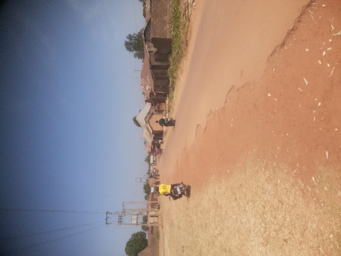 The image displays a street scene under a clear blue sky, identified as a location within Barakin, Nigeria. A reddish-brown road, appearing paved but with uneven surfaces and dirt, extends into the distance. To the immediate right, an unpaved, reddish-brown dirt shoulder shows signs of erosion and scattered light-colored debris. To the immediate left, a drier, light brown unpaved area borders the road. Two individuals on motorcycles are prominent. In the mid-ground left, a person wearing a bright yellow shirt with the number '69' on the back rides a light-colored motorcycle away from the camera. Further down the road on the right, another person operates a dark-colored motorcycle, also moving away from the camera. Additional indistinct human figures and vehicles are visible further in the background along the road. Along the right side of the road, a continuous line of single-story buildings is visible. These structures appear to be constructed from local materials, possibly mud bricks, and feature a variety of roofing, including corrugated metal. Many buildings exhibit signs of wear or partial disrepair. On the left side of the road, a series of utility poles with overhead electrical lines, including a visible transformer assembly, run parallel to the road. Sparse trees are visible behind the buildings and in the distant background. The scene is illuminated by strong daylight.