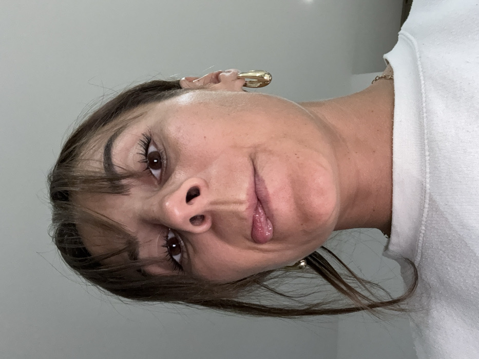 A woman poses for a selfie, shot from a low angle. She has brown hair with bangs, and her eyes are also brown. She sticks her tongue out slightly. She wears a large, gold-colored ear cuff on her right ear. She is wearing a white sweatshirt and a delicate gold chain is visible around her neck. The background is a neutral, light gray.