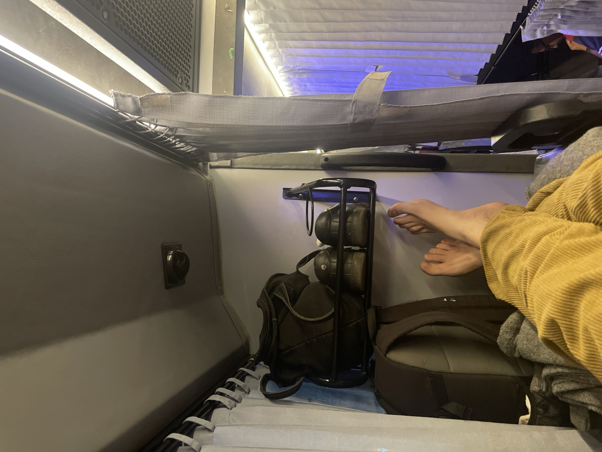 A low-angle interior shot appears to be taken from a bed or cot, with a person lying in it, feet exposed, wearing mustard-colored clothing. Next to the person is a dark gray backpack. A black metal rack holding a pair of dark shoes sits nearby. The interior space is confined, possibly in a vehicle or a small room. Gray walls and a gray ceiling with what looks like a blind system above create a neutral-toned environment. The image does not provide any information that indicates a location in Kolhapur, India.