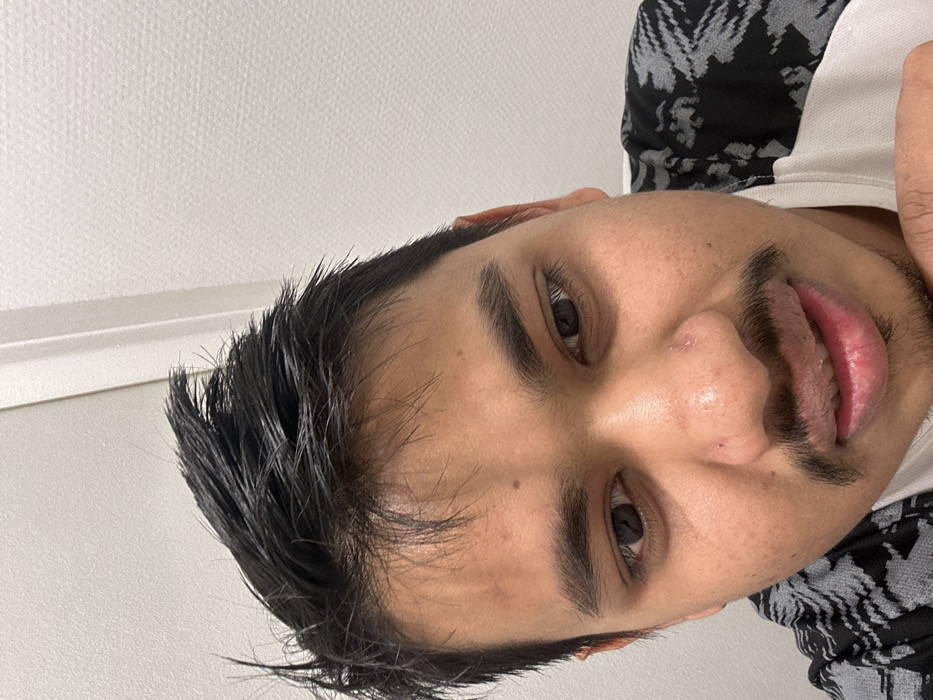 A close-up, slightly angled selfie shows a man with dark hair styled upwards and dark eyes