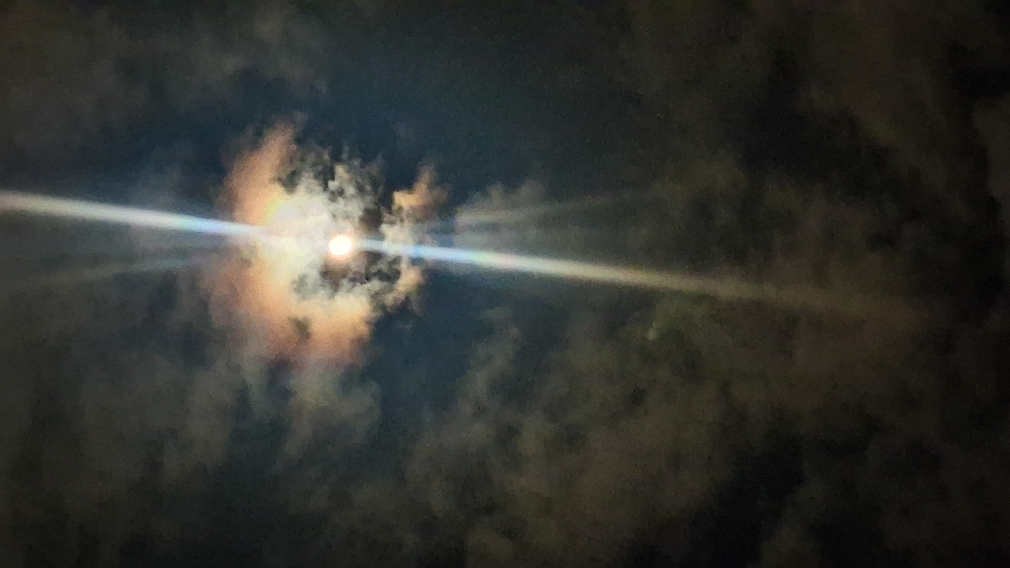 The image depicts a celestial scene at night, likely the moon, obscured by clouds and surrounded by a halo-like iridescent effect. A bright beam of light, possibly lens flare or atmospheric refraction, crosses horizontally through the moon. The surrounding sky is dark, with varying density of cloud cover. The location cannot be determined as Goce Delcev, Bulgaria without further information.