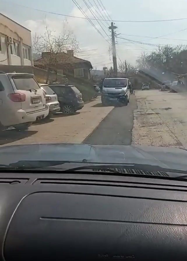 view from inside a car driving down a slightly rough, narrow street in what appears to be a village or small town. Several parked cars are visible on the left side of the road, with a few buildings and trees lining the street. Power lines stretch across the sky above. The day seems bright, and the sky is partly cloudy. Smoke can be seen in the distance down the street.