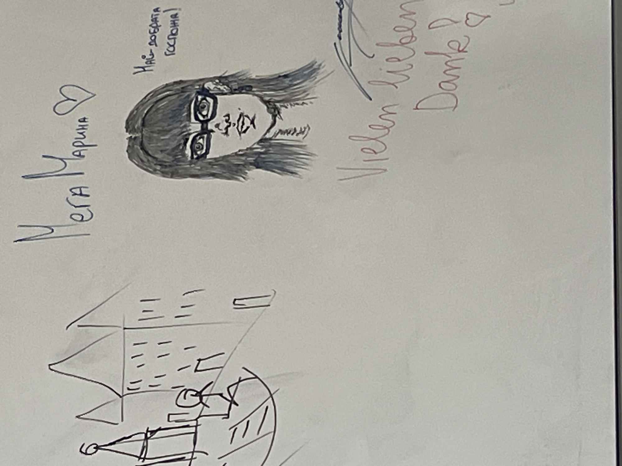 The image displays a white surface, likely a whiteboard or paper, covered with informal drawings and handwritten text. On the upper left, a simplified black-outline drawing depicts a cityscape featuring a building with a spired roof, another building with an irregular roofline, and multiple rectangular elements suggesting windows or doors. A stick-figure individual is positioned in front of these structures, appearing to sit on a curved base. To the right, a more detailed ink drawing portrays a woman's head and upper chest. She has dark, shoulder-length hair with bangs, wears eyeglasses, and her lips are slightly parted. The drawing utilizes black outlines with grey shading for hair and facial contours. Above this portrait, text in blue Cyrillic script reads "Мега Марина" followed by a heart symbol. To the right of the portrait, additional blue Cyrillic text states "Най-добрата госпожа!". Below the portrait, red script reads "Vielen lieben Dank!" with a small heart symbol appended. The white surface exhibits faint smudges and lines from previous markings. The specific location within Buzovgrad, Bulgaria, is not discernible from the visual content; the scene is confined to the depicted surface.