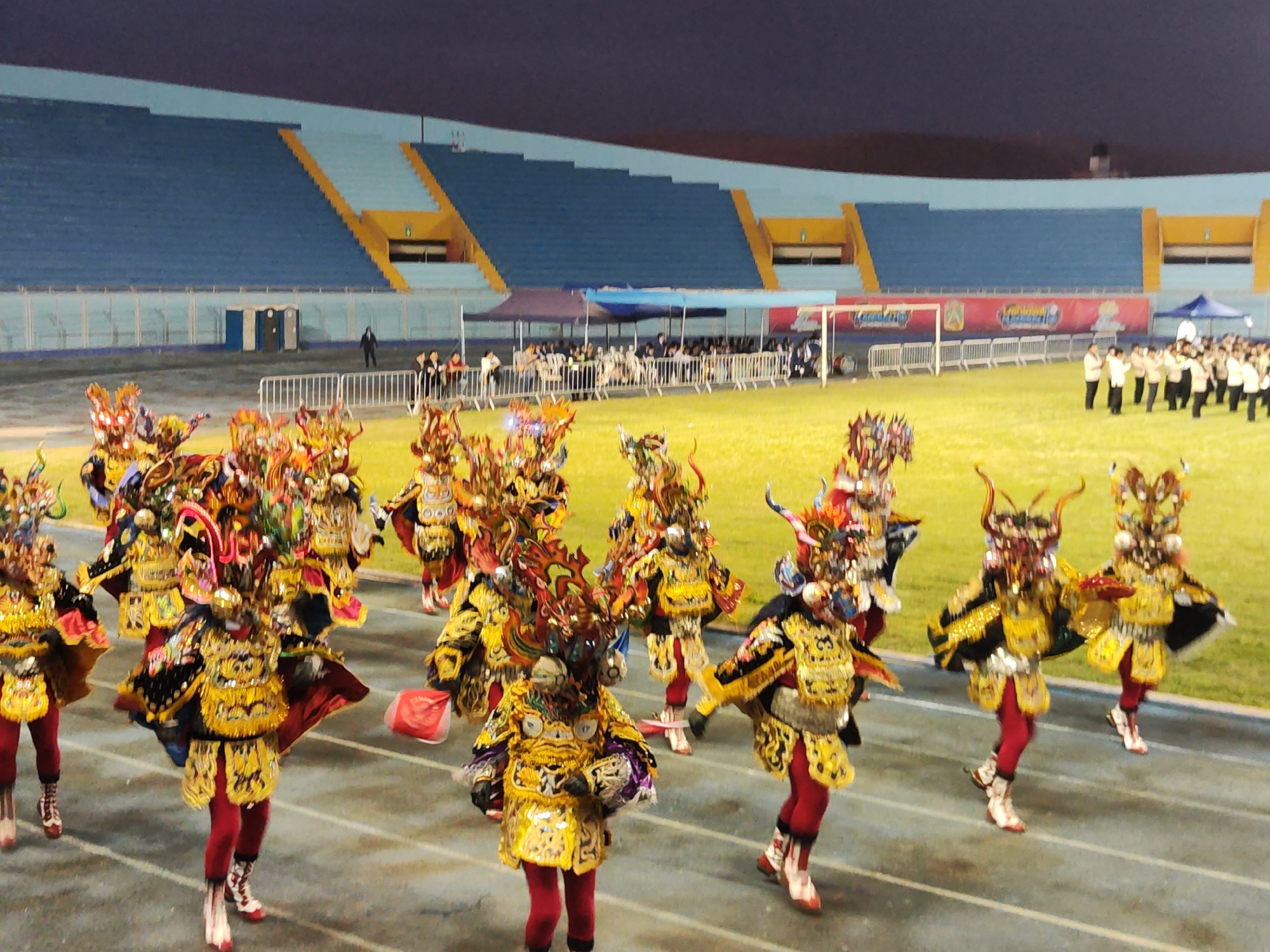The image depicts an outdoor night scene within a stadium located in the city of Coronel Gregorio Albarracín Lanchipa, Peru. Approximately two dozen individuals are actively performing a traditional dance on a blue-grey athletic track in the foreground and midground. These dancers wear elaborate, multi-colored costumes predominantly featuring gold, yellow, black, and red fabrics, adorned with extensive embellishments, sequins, and large, ornate masks, some with prominent horns and elaborate headpieces. They are dressed in red pants and white or light-colored boots, moving in various dance postures across the track from left to right. To the right, on the illuminated yellow-green grass field, a group of approximately 15-20 individuals in light-colored uniform shirts and dark pants are standing in organized formation. Behind them, a white soccer goal post is visible, alongside event banners displaying logos and text. A section of spectators is observing the event from behind white metal crowd control barriers under a blue canopy tent in the midground, to the left of the uniformed group. In the background, tiered stadium seating in sections of light and dark blue rises steeply, interspersed with yellow staircases/aisles. Two dark-colored portable toilets are positioned near the base of the stadium wall on the left. The sky above is dark, indicating the event is taking place at night under artificial illumination.