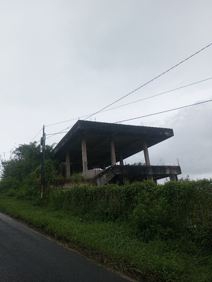 An elevated, multi-level concrete structure is situated beside a dark asphalt road in Babaliya Mal