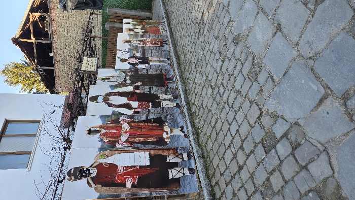 The scene depicts a cobblestone street in Tryavna, Bulgaria, under bright daylight. Seven human-sized cardboard cutouts, designed for photographic interaction with blacked-out face sections, are arranged linearly along the left side of the street, facing right. Each cutout portrays an individual dressed in traditional Bulgarian folk attire, featuring varied colors and patterns including red, white, and dark fabrics, distinct hats, vests, sashes, and patterned stockings. The street surface consists of irregularly shaped gray cobblestones, with some gravel visible between the gaps, and a narrow curb separating it from a strip of dirt and sparse grass. Behind the cutouts, a low wooden fence-like structure with dark posts and horizontal elements extends to the right, partially obscured by the cutouts. A small green hedge is visible beyond this fence on the far right. An unreadable wooden sign is suspended from a support structure behind the cutouts. Overhanging bare vines or branches form a trellis-like structure above the display. In the background on the left, a white two-story building with a brown-framed window on its upper level is visible. Bare wires or vines are affixed to the white facade below the window. To the right, an older, partially dilapidated brick building with an exposed wooden roof structure and missing tiles stands against a clear blue sky. A large, verdant conifer tree is prominently positioned behind and to the right of this brick structure. No active human subjects are present in the image.