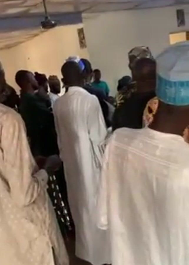 Inside a brightly lit room, a group of men are gathered, mostly with their backs to the camera, wearing various traditional African garments, including white robes and caps. The men are closely packed together, some facing each other as if in conversation or greeting. The camera angle is low, looking up at the crowd. The room is relatively simple with a white ceiling, visible light fixtures and ceiling fans.