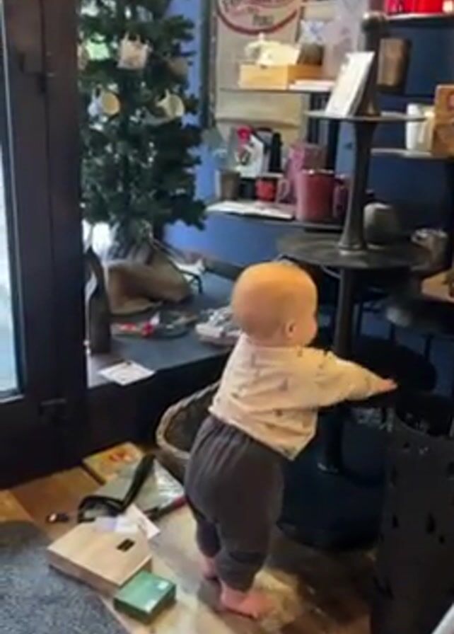 A short, low-angle video shows a baby standing beside a tiered display shelf in a store