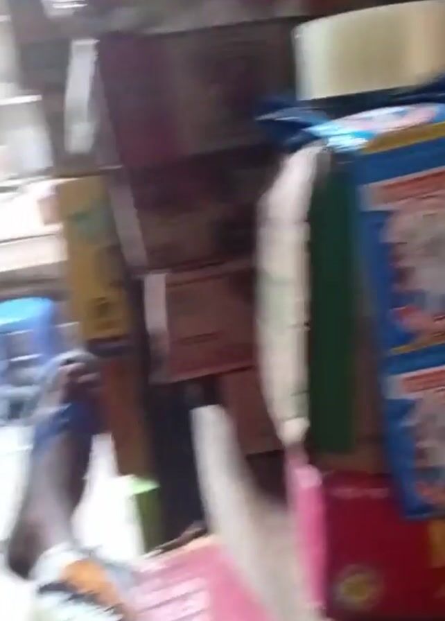 n indoor space filled with cardboard boxes stacked against a wall, predominantly brown and red. Some boxes are labelled with brand names such as "Indomie". In the foreground, two small blue sachets of "Cowbell" powdered milk hang from a box. A roll of adhesive tape is also visible. A person wearing blue flip-flops is seen walking past the boxes. The lighting is somewhat dim and the camera movements are shaky.