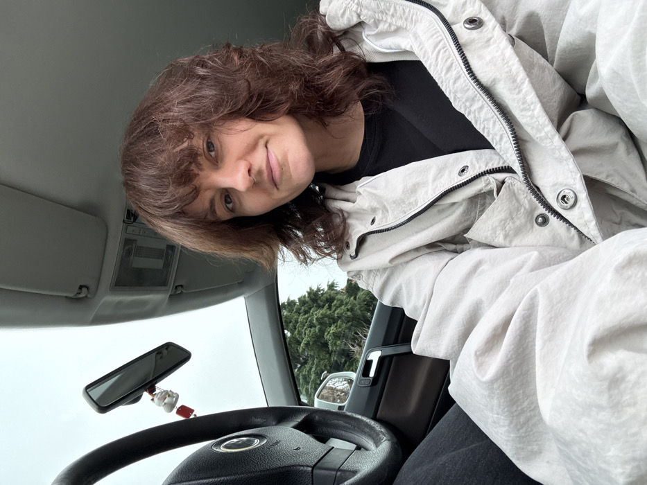 A person with brown hair is looking down with a slight smile inside a car. They are wearing a black shirt and a light-colored, puffy jacket. The steering wheel, rearview mirror with a small ornament, and part of the dashboard are visible. Outside, trees and a cloudy sky are seen through the windshield. The image is taken from a low angle, looking up at the person.