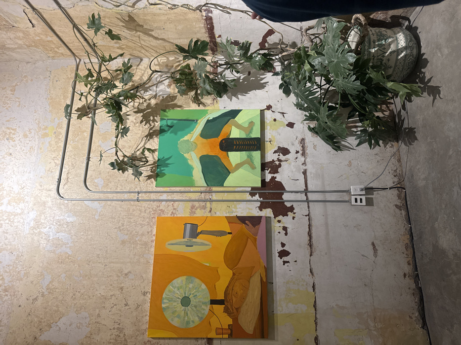 Two paintings hang on a distressed, peeling wall. The top painting features a person floating on a green and white body of water. The bottom painting is primarily orange, with a circular image on the bottom left. An electrical conduit runs horizontally between the paintings. Above, vines and potted plants are arranged to add a natural element to the display. The wall has exposed brick and cracked plaster.