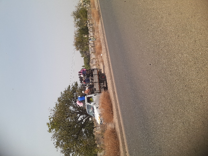 A white pickup truck, appearing to be an older model, is stationary on the unpaved shoulder of an asphalt road in the city of Bauchi, Nigeria