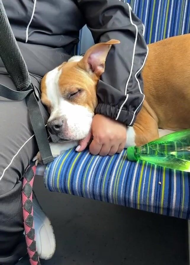 A brown and white dog is sleeping on a blue and yellow striped seat in what appears to be a public transportation vehicle. A person is seated next to the dog and cradles the dog's head in their hand. A leash is visible next to the dog. A green water bottle also sits on the seat next to the dog. The person is wearing a black track jacket with white trim. The lighting is moderate.
