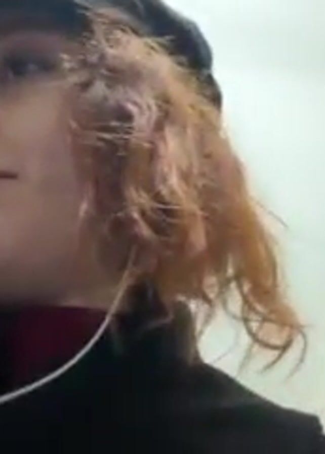 A young person with reddish-brown curly hair is walking. They are wearing a black cap, a dark jacket and white earbuds. The camera is looking up at them as they walk through a white hallway. There are wires and some sort of box on the wall. They appear to be talking but the audio is unavailable.