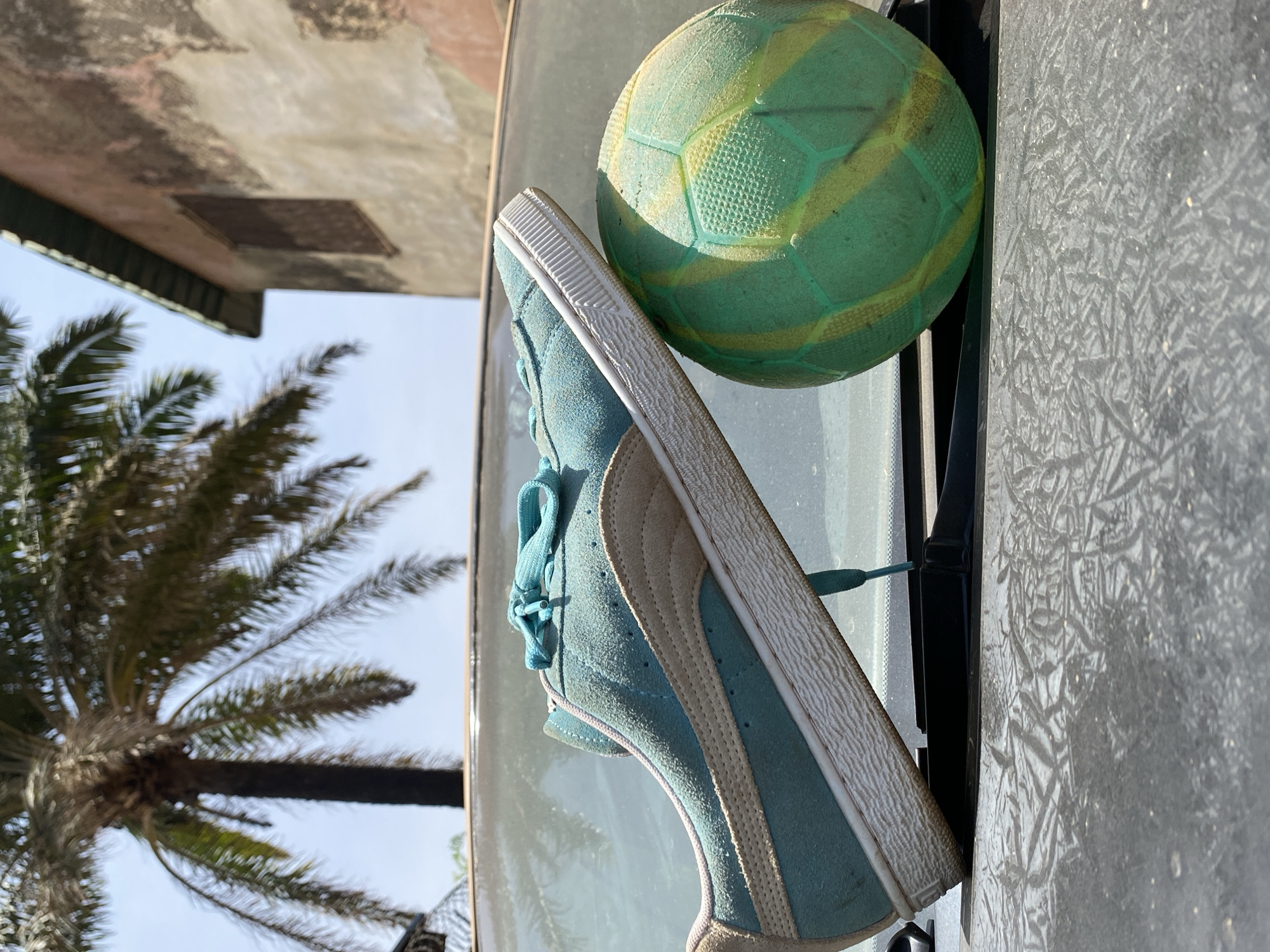 - "In Sabon Tasha, Nigeria, a single light blue suede sneaker, appearing to be a left shoe, is positioned diagonally, resting on a worn green and yellow soccer ball" by FM-V51a13, licensed under CC BY 4.0