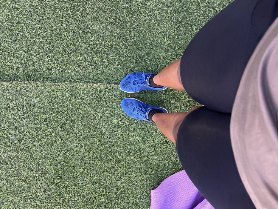 This image depicts a downward, first-person view of an individual standing on an artificial green turf surface in Katambe, Nigeria. The subject's lower body is visible, wearing black athletic shorts or leggings, black ankle socks, and blue mesh athletic shoes with white soles and blue laces. Their exposed skin, from mid-thigh to ankle, appears brown/tanned. A light grey fabric, consistent with a shirt or waistband, is visible at the bottom edge of the frame. In the lower-left corner, a partially rolled or folded purple exercise mat is present. A dark, thin vertical line marking runs through the artificial turf, positioned slightly to the right of the individual's center. The individual is stationary.
