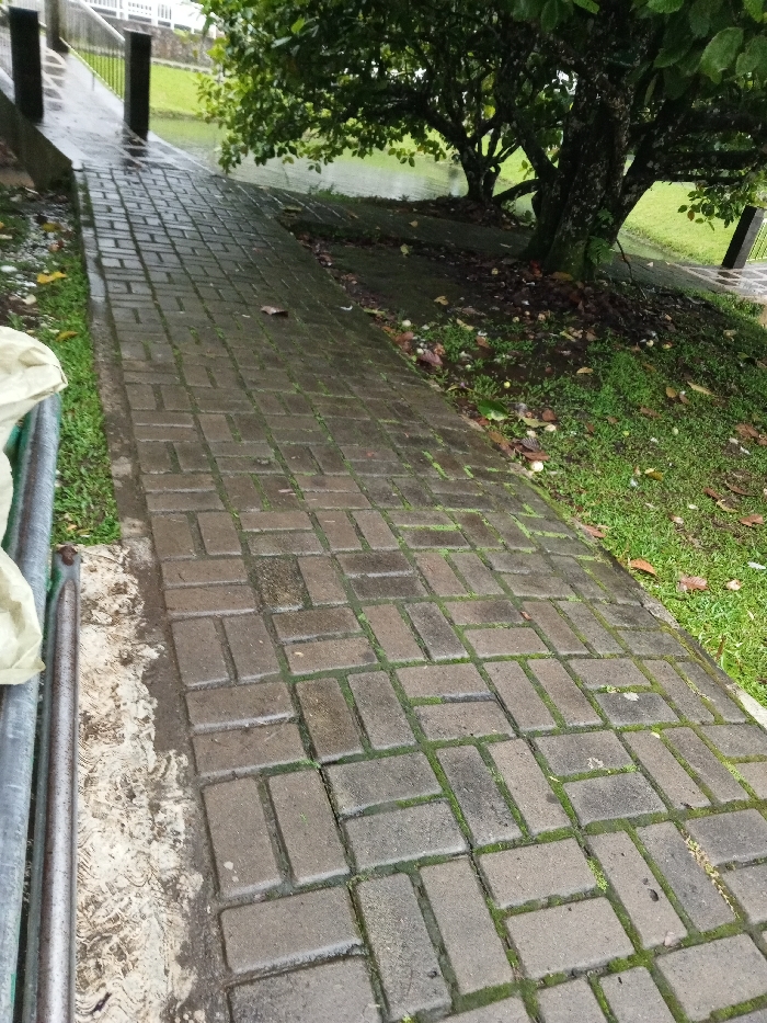 A herringbone brick path stretches from the lower left to the upper right of the frame. The bricks are damp and have some moss growing in the crevices. A green grassy area borders the right side of the path with scattered leaves and small debris. A tree with lush green foliage is on the right. A railing is on the left side of the path. The ground appears wet, suggesting recent rain.